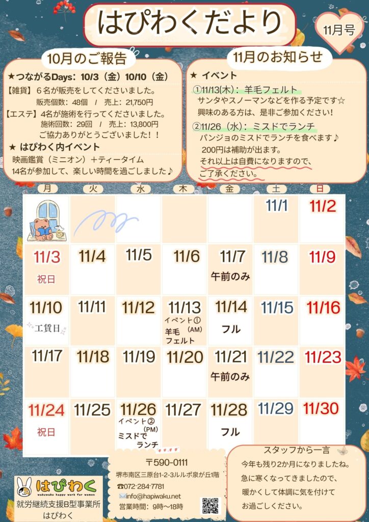 11月は段々と風が冷たくなってきて冬へと変わる時期なので皆さん服装などで調節して温かくして身体に気を付けてください(^_-)-☆